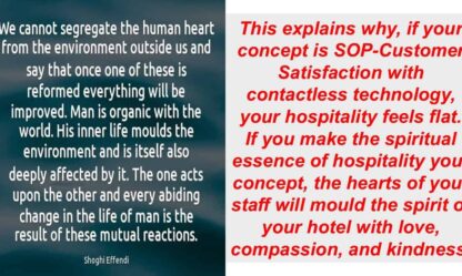 The hotel industry is stuck in a well-worn rut, and I don’t think that hoteliers realise this. New technology, virtual this and that, new beds, new room designs, new architecture, new spa treatments, etc., will not lift the industry out of the rut and transform the hospitality experience. Why? Because guests are human beings, and…